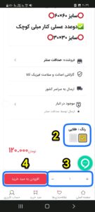 4.پس از انتخاب رنگ/سایز و تعداد کالا روی ” افزودن به سبد خرید” کلیک کنید.