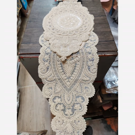 رومیزی دانتل طرح ترک قیطون دوزی شاین دار مدل خورشیدی سه تکه شامل