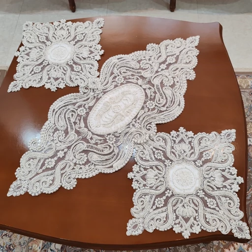 رومیزی سه تکه دانتل مخمل ترک اصل ملیله و مروارید دوزی شده کار دست دوز و پرکار